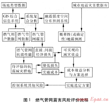 城市燃?xì)夤芫W(wǎng)震害風(fēng)險(xiǎn)評(píng)價(jià)涉及到場(chǎng)地類別、地震強(qiáng)度、燃?xì)夤芫W(wǎng)參數(shù)與抗震性能、抗震減災(zāi)措施和GIS信息系統(tǒng)等方面,其典型流程見圖1[8]。