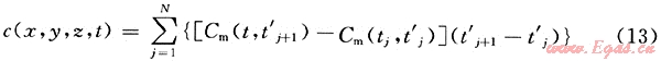 令t1=0,tN=t’,當(dāng)時(shí)間較短時(shí),取N=1000足可以滿足工程計(jì)算精度需求。則對任意時(shí)刻任意點(diǎn)處的濃度計(jì)算式為: