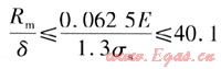 在計算極限狀態(tài)應(yīng)力時,當(dāng)管道最大軸向應(yīng)力不超過極限狀態(tài)應(yīng)力,錨固段的直管段就不會發(fā)生局部屈曲。管道的極限狀態(tài)應(yīng)力與臨界徑厚比Rm/δ有關(guān),當(dāng)管徑確定,鋼管的壁厚越薄,越容易發(fā)生局部屈曲。管道最大軸向應(yīng)力的極限狀態(tài)為: