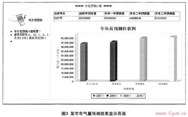 城市燃?xì)夤芫W(wǎng)建設(shè)項(xiàng)目立項(xiàng)之前,需要進(jìn)行燃?xì)庥脷饬款A(yù)測(cè)分析,如果沒(méi)有用戶,沒(méi)有燃?xì)馐褂眯枨?,那么投資建設(shè)的管線項(xiàng)目投資收益率低,從某種程度上講,投資時(shí)間過(guò)早或不宜,投資決策失誤。應(yīng)用氣量預(yù)測(cè)系統(tǒng)中的年用氣量預(yù)測(cè)功能模塊對(duì)城市燃?xì)馕磥?lái)3年用氣量進(jìn)行預(yù)測(cè),可以對(duì)燃?xì)鈿饬课磥?lái)發(fā)展有進(jìn)一步的認(rèn)識(shí),從而為項(xiàng)目投資決策提供重要依據(jù)。