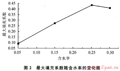 其得到的結(jié)果顯示在含水率小于30%時(shí),可以用最大填充系數(shù)值Φmax為0.57來計(jì)算,并且計(jì)算的結(jié)果與實(shí)驗(yàn)的測(cè)量值很吻合。本實(shí)驗(yàn)所使用的柴油黏度為5.12mPa·s,試圖運(yùn)用Pauchard的方法來尋求一個(gè)適當(dāng)?shù)?Phi;max值進(jìn)行漿液黏度的預(yù)測(cè),因此,反算出了在不同含水率下的Φmax值,如圖2所示。計(jì)算結(jié)果顯示含水率分別為25%和30%時(shí)的最大填充系數(shù)分別為0.436和0.414;而當(dāng)含水率分別為5%和15%時(shí)的最大填充系數(shù)分別為0.093和0.275。本結(jié)果與文獻(xiàn)中的差異可能是由于所選用的實(shí)驗(yàn)介質(zhì)和環(huán)境不同等綜合因素引起的。從圖2中還可以發(fā)現(xiàn):在含水率小于25%時(shí)最大填充系數(shù)隨著含水率的增加而增加,幾乎呈線性關(guān)系,以此擬合出填充系數(shù)與含水率的關(guān)系:
