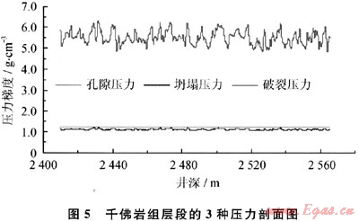 要在九龍山構(gòu)造安全開展欠平衡鉆井,前提是必須滿足井壁穩(wěn)定條件。測井資料表明,沙一段至珍珠沖組井段多含有泥巖段。因此,有必要采用泥頁巖水化模型分析坍塌壓力剖面。為此,本文利用測井資料,采用加拿大STAB-WELL欠平衡鉆井井壁穩(wěn)定分析軟件對不同層位進行井壁穩(wěn)定計算。圖4是沙一段的3種壓力剖面。從圖4中可以看出,該段破裂壓力高,孔隙壓力梯度為1.254g/cm3,最高坍塌壓力梯度為1.094g/cm3,欠平衡設(shè)計的鉆井液密度必須要高于最低坍塌壓力梯度,設(shè)計的范圍為1.10~1.25g/cm3。圖5是千佛巖組層段的3種壓力剖面,計算結(jié)果表明,該段最高坍塌壓力梯度為1.10g/cm3,欠平衡設(shè)計的鉆井液密度必須高于最低坍塌壓力梯度,設(shè)計的范圍為1.10~1.25g/cm3。