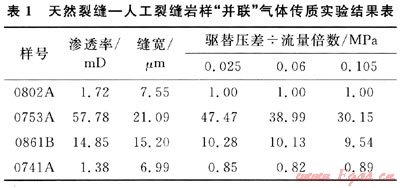 “并聯(lián)”傳質(zhì)實(shí)驗(yàn)中,裂縫寬度是影響致密砂巖天然氣傳質(zhì)的關(guān)鍵參數(shù),裂縫寬度越大其傳質(zhì)效率越高。在天然裂縫-人工裂縫并聯(lián)傳質(zhì)實(shí)驗(yàn)中,裂縫寬度相近的兩類裂縫,人工裂縫傳質(zhì)效率低于天然裂縫。分析認(rèn)為,由于人工裂縫縫面屬于新鮮斷面,有較多的可動(dòng)微粒,隨著驅(qū)替壓差的增加,氣體流速增大,參與運(yùn)移的微粒增多,部分微粒在縫面狹窄處沉積、堵塞,使得裂縫滲流能力大幅降低;另外實(shí)驗(yàn)過程是采取的連續(xù)變驅(qū)替壓力,圍壓不變的方式,在長時(shí)間的圍壓(3MPa)條件下,由于有效應(yīng)力的時(shí)間效應(yīng)[8],無支撐的人工裂縫寬度相應(yīng)降低,而天然裂縫經(jīng)過漫長的地質(zhì)演化,天然縫縫面間有膠結(jié)物、顆粒支撐,抗應(yīng)力敏感能力強(qiáng)于天然縫,裂縫寬度變化相應(yīng)較小,其滲流能力降低幅度小。