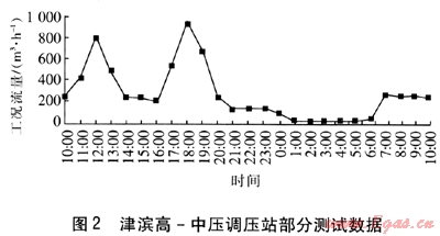 這就需要我們根據不同季節(jié)、不同時段管網負荷的峰谷情況,調整供氣工況。例如對河東區(qū)域供氣的衛(wèi)國道高-中壓調壓站、津濱高-中壓調壓站、張貴莊高-中壓調壓站,我們通過適當調低衛(wèi)國道高-中壓調壓站、津濱高-中壓調壓站調壓器出口壓力、關閉壓力,即衛(wèi)國道高-中壓調壓站、津濱高-中壓調壓站調壓器出口壓力為0.095MPa,關閉壓力為0.12MPa,張貴莊高-中壓調壓站調壓器出口壓力為0.11MPa,關閉壓力為0.14MPa。通過調整調壓器參數來實現高-中壓調壓站間大小流量自動切換,即用氣低峰時僅張貴莊高-中壓調壓站給河東區(qū)域供氣,用氣高峰時,衛(wèi)國道高-中壓調壓站、津濱高中壓調壓站、張貴莊高-中壓調壓站同時供氣,這樣可以有效避免高-中壓調壓站流量計每天小流量數據丟失問題。對給河北區(qū)供氣的金鐘高-中壓調壓站,我們采用一臺大調壓器及一臺小調壓器并聯(lián)運行,適當調低大調壓器出口壓力、關閉壓力,即大調壓器出口壓力為0.095MPa,關閉壓力為0.12MPa,小調壓器出口壓力為0.12MPa,關閉壓力0.15MPa,這樣用氣低峰時僅小調壓器供氣,用氣高峰時,大、小兩組調壓器同時供氣,這樣提高計量精度,并且避免由于僅大調壓器供氣造成調壓器頻繁開啟關閉產生氣體脈動流導致的計量誤差。