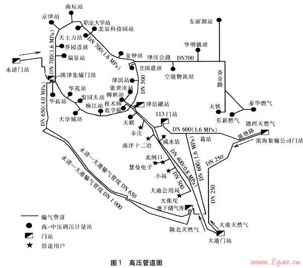 輸配分公司管理的4條輸氣管道納入集團公司封閉計量考核范圍,即“45km輸氣管道”及南、北半環(huán)輸氣管道(見圖1,圖中所標壓力為運行壓力)。“45km輸氣管道”是指由大港門站至津沽罐站DN 400mm管道及津沽罐站至大港公用局DN 500mm管道,設計壓力、運行壓力均為0.8MPa,兩條管道長度各約45km。南半環(huán)是指由陜津集輸門站沿外環(huán)線以南至衛(wèi)國道高-中壓調壓站的管道,設計壓力、運行壓力均為0.8MPa,長度為37.16km。北半環(huán)是指由陜津集輸門站沿外環(huán)線以北至衛(wèi)國道高-中壓調壓站及泰華燃氣、東麗湖高-中壓調壓站的管道,設計壓力為2.5MPa,運行壓力為1.6MPa,長度為66km。