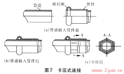 卡壓式連接是將“0”型密封圈,用專用卡壓工具壓入連接處,鉗壓后斷面呈六邊形的一種擠壓式連接方式。其優(yōu)點是操作方便,易于安裝;缺點是連接強度不夠高,抗外力能力差??▔菏竭B接見圖2。