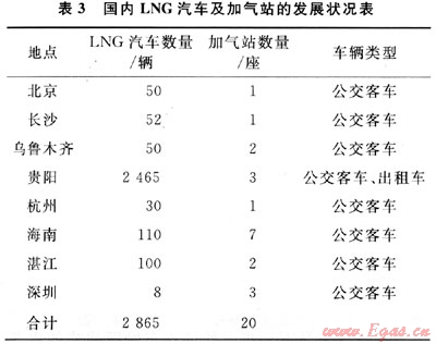 目前國內(nèi)只有北京、烏魯木齊、長沙、貴陽、海南等城市和地區(qū)進(jìn)行了LNG汽車技術(shù)示范應(yīng)用,并主要局限在公交車領(lǐng)域的應(yīng)用。據(jù)調(diào)查,截止到2009年12月全國僅有2800余輛LNG汽車運(yùn)行,已建成的部分LNG加氣站情況如表3所示。
