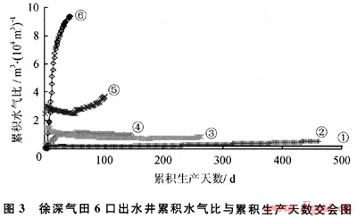 在定性劃分徐深氣田氣井出水類型基礎上,再通過日產水量與日水氣比界限法、累積產水量與累積產氣量交會法、累積水氣比與累積生產天數(shù)交會法定量劃分氣井出水類型。