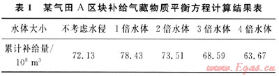 根據(jù)圖3采用常規(guī)物質(zhì)平衡法計(jì)算得到A區(qū)塊的動(dòng)態(tài)控制儲(chǔ)量為475.88×108m3,其動(dòng)態(tài)控制儲(chǔ)量遠(yuǎn)遠(yuǎn)大于A區(qū)地質(zhì)儲(chǔ)量,出現(xiàn)“超百”現(xiàn)象,不符合常理。分析認(rèn)為:該區(qū)塊與B區(qū)塊間存在相互補(bǔ)給和外溢漏失的情況,B區(qū)塊和A區(qū)塊相鄰并由一條斷層分隔,B區(qū)塊后期加鉆1口井測壓顯示地層壓力已降至27MPa,說明該區(qū)塊已被動(dòng)用(即產(chǎn)生了外溢)。應(yīng)用上述建立的補(bǔ)給氣藏物質(zhì)平衡方程可以計(jì)算收益區(qū)塊A區(qū)塊補(bǔ)給量的大小,其計(jì)算結(jié)果見表1。