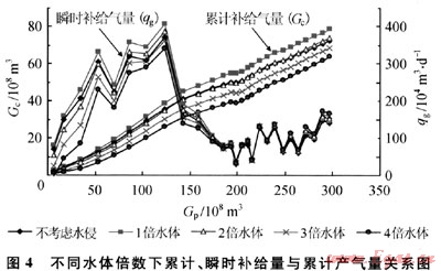 由圖4所預(yù)測的瞬時(shí)補(bǔ)給氣量顯示,氣田開采初期僅有A區(qū)塊開采,采氣速度迅速上升到4.5%,瞬時(shí)補(bǔ)給量(qg)也快速上升達(dá)到400×104m3/d;隨后由于氣田其他區(qū)塊投入開采,適當(dāng)調(diào)低了A區(qū)塊的采氣速度(維持在2.5%),瞬時(shí)補(bǔ)給氣量也降到120×104m3/d左右。采氣速度大小直接關(guān)系著地層壓力的降低幅度,因此,區(qū)塊間的壓力差是影響氣竄量大小的重要因素。