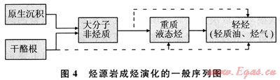 總之,有機質成烴是系列的演化過程(圖4),大分子非烴類是成油的最直接母源,其成因除傳統(tǒng)地認為由干酪根降解形成外,在保存較好的條件下(如咸水環(huán)境)可在沉積過程中直接形成,這種情況一般也與低熟油的形成有關,即原生沉積的非烴類有機大分子早期降解可形成低熟油。而干酪根由于所處烴源巖條件的差異可發(fā)生不同期的降解,按序列形成各類產物。重質液態(tài)烴開始形成時烴源巖真正進入生烴階段,依次進行其后各級別的降解。該序列是演化的主體過程,但在每一級降解的過程中,都會伴隨生成其他級別的產物,不同的生烴階段所處的降解級別也有差異。