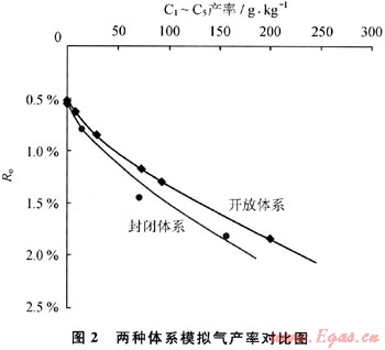 烴源巖在降解生油的同時生成烴類氣體(圖2)。隨熱演化程度增高,開放體系和封閉體系的烴氣產率大致按相近的趨勢增長,在達生油高峰之前(Ro<1.O%)二者差別不大,但其后差別逐漸明顯。在相同的成熟階段封閉體系比開放體系氣產率略低,說明壓力的存在對氣體的生成有一定抑制作用。前人大多認為封閉體系與開放體系相比,由于二次裂解生成的氣體較多,這應與實驗中實現(xiàn)的條件有關。本次封閉體系的實驗中,烴源巖樣品位于反應區(qū),其生成的油氣從樣品排出后由于存在流體壓力的調整(恒定壓力)及上浮現(xiàn)象會繼續(xù)運移遠離反應區(qū),在高壓釜溫度相對較低的上下端部儲集起來。因此這是一個與地下條件較為接近的生排烴動平衡過程。