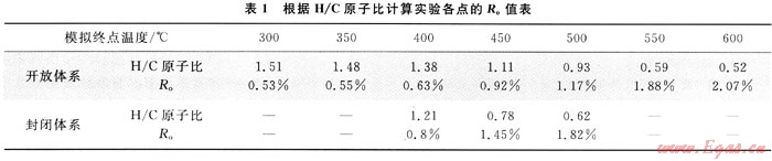 表1結果顯示,同一溫度條件下對封閉體系計算的Ro值較高,主要與開放體系模擬過程中不斷注入水帶出熱量有關,釜內樣品的實際溫度低于測量的結果。