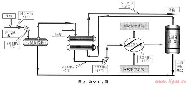 當(dāng)濕天然氣壓力較高或溫度較低時,都易形成天然氣水合物,必須加入天然氣水合物抑制劑。在開工初期,雖然井口溫度較高,但管線溫度場未建立,也有生成天然氣水合物的可能。采用注入甲醇不回收工藝,采用移動注醇車以節(jié)省投資;在凈化工藝的低溫分離段,采用注入乙二醇并回收的工藝,與注甲醇工藝相比,具有占地面積小、投資低、環(huán)境污染小、能耗小、運(yùn)行費(fèi)用低等優(yōu)點(diǎn)。