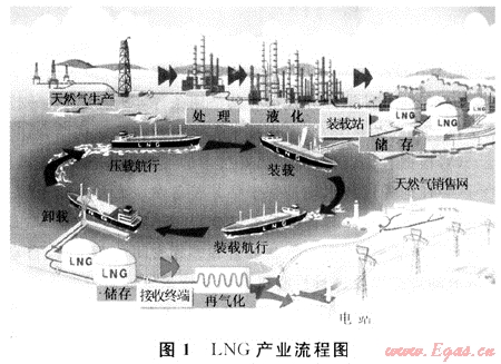 油氣資源開(kāi)發(fā)利用是一個(gè)產(chǎn)業(yè)鏈,其流程如圖1,源頭是油氣田的勘探和開(kāi)發(fā)。從國(guó)外購(gòu)買(mǎi)油氣資源不是一個(gè)簡(jiǎn)單的貿(mào)易問(wèn)題[3]。廣東LNG項(xiàng)目,其確定上游供應(yīng)商、接收站和輸氣管網(wǎng)建設(shè)、LNG船制造、下游電廠建造及居民用氣改造等,都在統(tǒng)一的計(jì)劃安排下,同步實(shí)施。廣東LNG項(xiàng)目的氣源供應(yīng)商招標(biāo),業(yè)主向澳大利亞、馬來(lái)西亞、卡塔爾、印度尼西亞、俄羅斯等國(guó)的7家公司發(fā)出邀請(qǐng),澳大利亞天然氣公司(ALNG)中標(biāo)最終成為廣東LNG的供應(yīng)方,并且自動(dòng)成為廣東LNG運(yùn)輸項(xiàng)目外商合作伙伴,ALNG推薦殼牌(Shell)公司參加并協(xié)助商船建造工作。國(guó)內(nèi)第一條LNG專(zhuān)用船由上海滬東船廠和法國(guó)大西洋船廠(Aker yards)合作承建,招商局集團(tuán)與中遠(yuǎn)集團(tuán)合資組建中國(guó)第一支LNG船隊(duì),承擔(dān)廣東LNG項(xiàng)目的液化天然氣運(yùn)輸;廣東LNG的接收站及外輸管網(wǎng),則由中海油與BP石油公司牽頭,吸納了國(guó)內(nèi)部分燃?xì)馄髽I(yè),發(fā)起成立廣東大鵬LNG公司,負(fù)責(zé)接收站和輸氣管網(wǎng)的建設(shè)和運(yùn)營(yíng)。