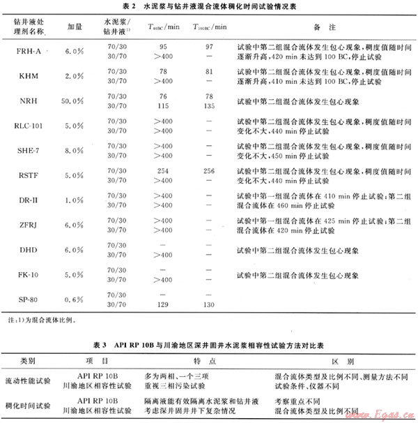 國外對井下流體相容性較重視,嚴格按照API RP 10B《油井水泥試驗推薦做法》執(zhí)行。但在國內一般采用配漿藥水或稀釋處理了的鉆井液作為隔離液,規(guī)范性差[3~5]。API RP 10B與川渝地區(qū)深井固井相容性試驗方法的特點及區(qū)別見表3。