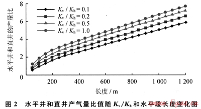 根據(jù)現(xiàn)代油藏工程計(jì)算,某凝析氣藏水平井和直井采氣量比值隨Kv/Kh值和水平段長度的變化而變化(圖2)。當(dāng)Kv/Kh值為0.2、0.5和水平段長度為500m的條件下,水平井和直井產(chǎn)氣量比值分別為3.6和4.2。由此可見滲透率非均質(zhì)影響水平井的增產(chǎn)效果。