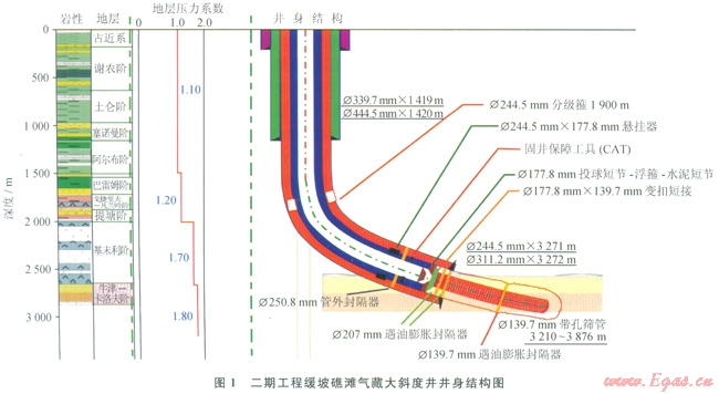 阿姆河右岸鉆遇地層具有高壓淺層次生氣藏、高壓鹽水層、高壓目的層、高產(chǎn)儲層、巨厚鹽膏巖”等“四高一厚”的特征,嚴重影響高效、安全鉆井(前蘇聯(lián)在此鉆井期問事故頻發(fā),鉆井周期長,工程報廢率高達30)。同時,為了實現(xiàn)稀井高產(chǎn)、高效開發(fā)的目的,需要大規(guī)模實施大斜度井整體開發(fā),造斜增斜段均在鹽膏巖中,對井眼軌跡控制提出了更高要求。①在設(shè)計階段,地質(zhì)考慮工程施工難度,盡可能避開淺層走滑斷層、次生人工氣藏區(qū)及高壓鹽水層等非目的層復雜帶,根據(jù)地質(zhì)特征,共同確定井身結(jié)構(gòu)和井眼軌跡;工程考慮地質(zhì)和開發(fā)需要,在儲層變化大的地區(qū),先鉆導眼,搞清儲層分布,然后再側(cè)鉆確保鉆探效果,完井滿足后期生產(chǎn)作業(yè)的需要。②在實施階段,非目的層鉆進期問,地質(zhì)要為工程服務,做好層位預測、卡準中完井深、特殊巖性預報、壓力預測等,規(guī)避鉆完井風險,目的層鉆進期問,丁程為油氣發(fā)現(xiàn)、安全作業(yè)服務,尤其是精細控壓、地質(zhì)研究、人斜度井水平井軌跡控制、儲層保護,確保鉆井目的實現(xiàn)。尤其是強化隨鉆分析,實時跟蹤,及時優(yōu)化調(diào)整,重點工序和關(guān)鍵環(huán)節(jié)地質(zhì)工程駐井現(xiàn)場辦公,及時決策,確保優(yōu)質(zhì)安全。通過實施地質(zhì)工程一體化,鉆井成功率為100%,大斜度井(見圖l)、水平井全部獲得高產(chǎn),單井無阻流量900×l04l500×104m3d,為高效開發(fā)奠定了堅實的基礎(chǔ)。
