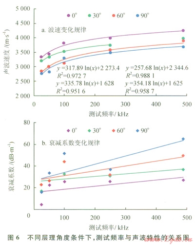 實(shí)驗(yàn)結(jié)果表明,隨著測試頻率增加,聲波波速也增大,并且呈對數(shù)正相關(guān)性(圖6-a),頻散現(xiàn)象明顯,在不同層理角度條件下的各組巖心統(tǒng)計(jì)結(jié)果非常吻合,具有很強(qiáng)的規(guī)律性。而聲波衰減系數(shù)隨著測試頻率的增加總體也呈增大的趨勢(如圖6-b),但是變化幅度規(guī)律性不強(qiáng),同層理角度條件下的各組巖心統(tǒng)計(jì)結(jié)果相近。該結(jié)果對于儲層評價中聲波參數(shù)的選擇具有一定的指導(dǎo)意義。