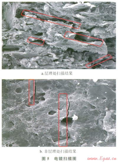 頁巖的層理發(fā)育方向是研究和表征層理最重要的參數(shù)之一。對頁巖進(jìn)行電鏡掃描(圖5)可知,層理面處的膠結(jié)物較多,黏土礦物的產(chǎn)狀相對比較混亂,且相對非層理處的微裂縫更加發(fā)育,可知層理面的存存減小了波速,增加了衰減。因此,圖4-a中出現(xiàn)了波速在層理為90°時要遠(yuǎn)小于層理為0°時的情況。層理角度變大、衰減增加是由于角度越大,聲波穿透的層理數(shù)增加所致,孔隙度增加層理面的微裂縫數(shù)也會增加,因此出現(xiàn)圖4-b所示的增加規(guī)律。利用上述規(guī)律,可以綜合利用聲波資料進(jìn)行儲層評價,對層理角度進(jìn)行預(yù)測。