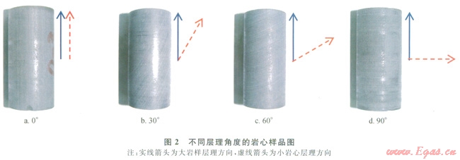 在此基礎(chǔ)上,分別沿平行層理方向(圖2-a)、與對稱軸呈一定角度(30°、60°,如圖2-b,2-c)、垂直于平行層理方向(圖2-d)進(jìn)行小巖心鉆取,利用鉆機(jī)控制層理角度誤差小于5%,為了不影響測試效果,所切制樣品直徑均在1英寸左右(25.4mm),長度介于37.87~51.11mm,兩端面磨平拋光。