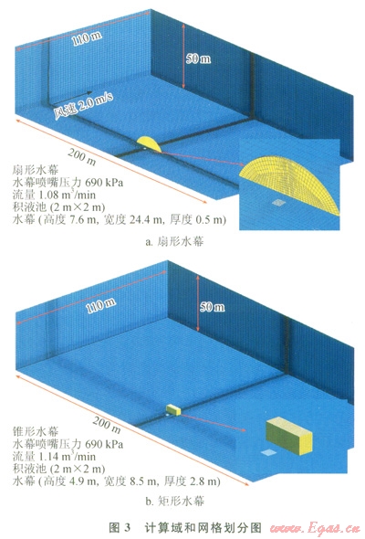 對比相同壓力、相同流量下的扇形水幕與矩形水幕,根據(jù)表1中兩種水幕的壓力和流量,兩個錐形水幕的流量與一個扇形水幕的流量近似相等,并可以近似地看成一個矩形水幕。對于上述泄漏場景下的擴(kuò)散情形,分別采用扇形水幕和矩形水幕進(jìn)行阻隔氣體,筆者對兩種水幕進(jìn)行CFD模擬計算,計算域和網(wǎng)格劃分如圖3所示。由于計算域為對稱區(qū)域,所以為了節(jié)省計算資源,縮短計算時間,求解時僅對計算區(qū)域的一半進(jìn)行計算[14]。