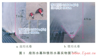 在LNG場站消防系統(tǒng)中,經(jīng)常會用到兩種噴射水幕,即扇形水幕(Flat Fan Spray Water Curtain)和錐形水幕(Cone Spray Water Curtain) [8,10](如圖l)。對于扇形噴射水幕的形成,工業(yè)中經(jīng)常采用如圖1-a的裝置,將高壓水柱噴射到金屬擋板上,水柱沿?fù)醢迳闲?,呈扇形或者半圓形展開,一般扇形水幕為可移動式水幕;錐形水幕則是噴頭由下向上噴出形成,呈一個倒立的錐形,一般情況下需要數(shù)個噴頭并排一起工作。
