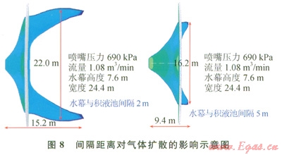 下面對扇形水幕的參數(shù)進(jìn)行研究,包括噴水量和水幕和擴(kuò)散源之間的間隔,這二者是影響水幕阻擋效果的主要因素。圖7顯示了不同水流量下,水幕對氣體擴(kuò)散的影響,在相同的大氣條件下,水流量越大,形成的水幕尺寸也就越大。當(dāng)扇形水幕流量為l.32m3/min,壓力1035kPa時,水幕高度為11.4m,寬度45.6m,LNG蒸發(fā)氣體下風(fēng)向擴(kuò)散的安全距離為8.3m。