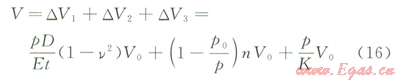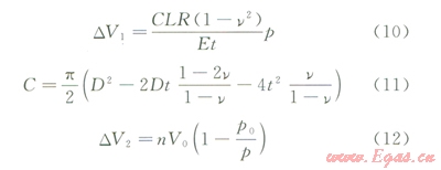 實(shí)踐中,對(duì)于式(10),由于徑向?yàn)楣艿辣诤穹较?,?duì)于大口徑薄壁管,擘厚變化引起的管道體積變化較小,以規(guī)格為l219×22mm規(guī)格的管道為例,經(jīng)測(cè)算,僅為DVl5%,若考慮空氣、水的壓縮性,該比例還將大大降低。因此,本文將該壁厚變化引起的體積變化忽略,得到DVl表達(dá)式為:
