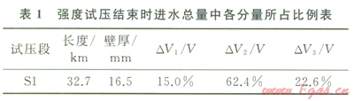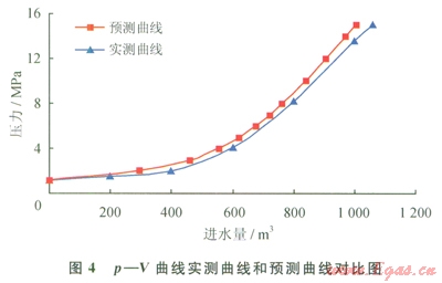 同時(shí),分析預(yù)測(cè)曲線中V的組成,其中DV1、DV2、DV3各自所占的比例見表l,由水壓縮性計(jì)算而得的DV3,其值超過(guò)DV1,是試壓進(jìn)水量的一個(gè)重要因素,不可在計(jì)算中忽略。