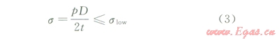 式中P為管道試壓壓力或運(yùn)行壓力,MPa;D為管道外徑,m;t為管道壁厚,ms為內(nèi)壓產(chǎn)生的環(huán)向應(yīng)力,應(yīng)不超過(guò)管道的屈服強(qiáng)度,MPa。