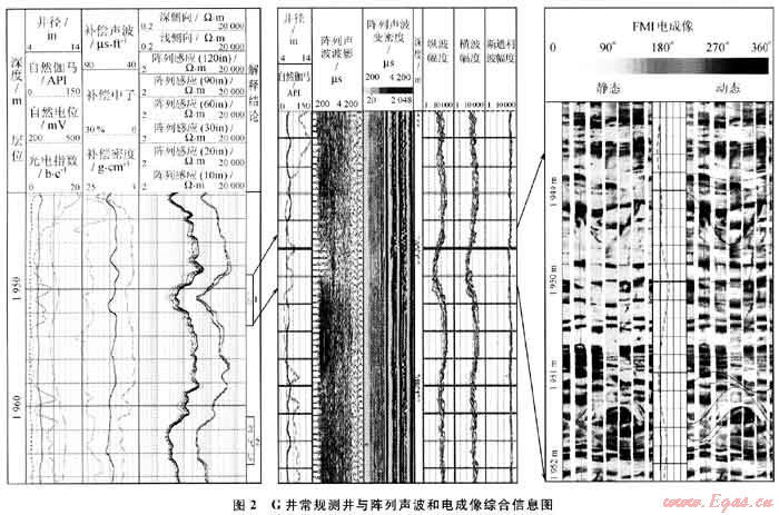 低孔裂縫型儲(chǔ)層:利用常規(guī)測(cè)井資料難以識(shí)別,需根據(jù)成像測(cè)井圖上的裂縫響應(yīng),陣列聲波變密度干擾圖形、波形幅度降低及陣列聲波縱波、橫波和斯通利波能量衰減,斯通利波計(jì)算的滲透率大等特征識(shí)別。如川東地區(qū)G井須家河組1948.8~1953.2m井段,用常規(guī)測(cè)井資料識(shí)別難度較大,但陣列聲波變密度干擾明顯、波形幅度降低及陣列聲波縱波、橫波和斯通利波能量有明顯衰減,電成像圖上有明顯裂縫顯示,可清楚說(shuō)明該段裂縫較發(fā)育,為低孔一裂縫型儲(chǔ)層,中途測(cè)試產(chǎn)天然氣1.42×104m3/d。其測(cè)井特征詳見圖2。