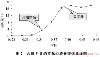 合川Y井:在半夜O0:35,溢流量由0.6m3增至3.4m3,準(zhǔn)備采取關(guān)井措施,直到00:39,關(guān)井才完成,期間耗費(fèi)時(shí)間4min,溢流量由3.4m3增加到16.2m3,此時(shí),循環(huán)排氣處理過程中,套壓上漲至16.9MPa,溢流變化情況如圖2所示。