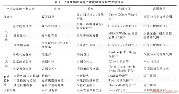 筆者將各種已成功應用于油氣田生產(chǎn)的嚴重段塞流控制方法進行了總結,結果如表1所示。每種控制方法都有一定的適用范圍,隨著流體物性、海底路由、油氣田產(chǎn)量以及下游設施的不同而不同。應針對不同的工程項目,開展具體模擬分析,必要時可以結合多種方法來控制嚴重段塞流。
