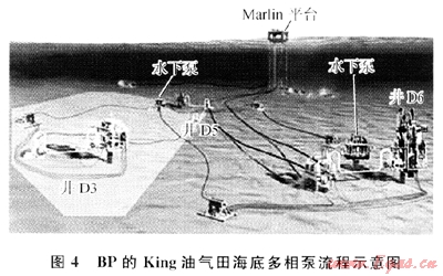 Henriot提出多相泵可用來消除嚴重段塞流[7]的方法。2007年英國石油公司(BP)在GOM的King油氣田水深1676m處安裝并啟用了2臺海底多相泵,其流程示意圖如圖4所示,在增壓和保證了油氣田產(chǎn)量的同時,也削弱了嚴重段塞流。