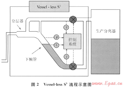 2004年Kovalev又提出了Vessel-lessS3[4]們的方法,其流程示意圖如圖2所示,通過1個體積更小的管道來替代原來的小型預分離器,流體在管道里完成了分層,液體下傾,氣體上升。