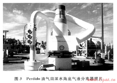 Song和Kouba提出了海底氣液分離[5]的方式,分離后氣液分輸至平臺,段塞流因此而被消除。2009年Henning報道Tordis、BC~10和Pazflor等油氣田都應用了此技術[6]。2010年3月Shell在墨西哥灣(GOM)水深達2440m的Perdido油氣田投產(chǎn),意味著其應用的深水海底氣液分離技術取得了成功,其海底氣液分離器如圖3所示。