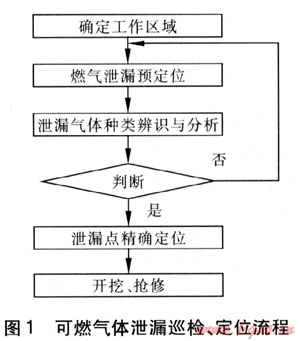 日常的巡檢可采用車載或便攜檢測設(shè)備確定工作區(qū)域,如發(fā)現(xiàn)泄漏還需對泄漏氣體進(jìn)行種類辨識,排除其他氣體(如沼氣)的干擾。對已經(jīng)確定泄漏的管段可先實(shí)施對泄漏點(diǎn)的預(yù)定位,由在線檢測或日常巡檢確定泄漏的大致區(qū)域,再進(jìn)行精確定位,如遇硬質(zhì)路面或在大片區(qū)域內(nèi)均檢測到高濃度可燃?xì)怏w,需結(jié)合路面鉆孔機(jī)和吸真空系統(tǒng)打孔定位??扇?xì)怏w泄漏巡檢、定位流程見圖1。