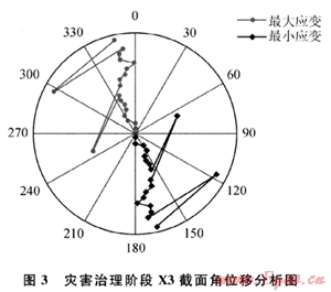 首先,管體應(yīng)力釋放要控制在合理范圍內(nèi)。一定長度內(nèi)的管體應(yīng)變既然已發(fā)生,就很難再回復(fù)到初始狀態(tài);過度的釋放有可能會加劇該管段的力學(xué)損傷,甚至影響相鄰管段的穩(wěn)定和安全。換言之,管體的應(yīng)力釋放是以減緩并消弱災(zāi)害風(fēng)險為目標的,而不是像改線那樣去根除風(fēng)險。治理階段的應(yīng)變動態(tài)監(jiān)測可以控制應(yīng)力釋放的程度。其次,管體應(yīng)力的釋放要從低應(yīng)變區(qū)逐段向高應(yīng)變區(qū)迫近,而不是直接開挖管道變形最為劇烈的管段,否則有可能導(dǎo)致管體在卸載后大幅度振蕩,加劇管體損傷。隨著管溝的逐段開挖,該管段應(yīng)力分布也會發(fā)生即時變化,此時的應(yīng)變監(jiān)測數(shù)據(jù)可指導(dǎo)開挖進度和開挖位置調(diào)整。最后,采用管道應(yīng)變監(jiān)測還可以獲得管線各監(jiān)測截面實時應(yīng)變極值的角度(如圖3),即角位移分析。角位移分析圖能夠清晰地表明最大應(yīng)力的方向、管道彎曲的方向,以及整個管段彎曲扭轉(zhuǎn)的狀態(tài)及趨勢,進而指導(dǎo)對管體進行細微的挪移。