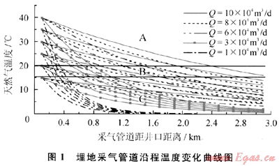天然氣水合物防治效果主要受管輸壓力、溫度、流量和距離等因素影響。為此,根據(jù)埋地管道散熱損失情況,模擬計(jì)算管道沿程溫度變化情況,各參數(shù)范圍確定為:氣井產(chǎn)量為(1~10)×104m3/d;井口溫度為15~40℃;運(yùn)行壓力為7.0MPa;管道規(guī)格為Φ76mm×4mm;采氣管道長(zhǎng)度為0~3.0km;管道保溫材料為40mm硅酸巖棉殼;管道埋深為1.8m。