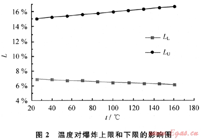 式中LU,t是溫度t時(shí)的爆炸上限;LL,t是溫度t時(shí)的爆炸下限;LU是t=25℃時(shí)的爆炸上限;LL是溫度為t=25℃時(shí)的爆炸下限;t為燃?xì)鉁囟取?/span>