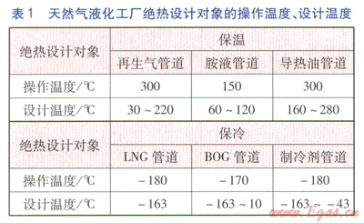 在天然氣液化工廠絕熱設(shè)計(jì)中,一般考慮對(duì)再生氣、胺液、導(dǎo)熱油等管道進(jìn)行保溫,對(duì)LNG管道、BOG管道、制冷劑管道進(jìn)行保冷。天然氣液化工廠絕熱設(shè)計(jì)對(duì)象的操作溫度、設(shè)計(jì)溫度見表l。