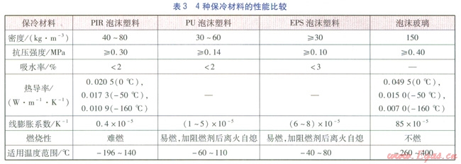 PIR泡沫塑料是一種深冷型保冷材料,具有優(yōu)良的耐熱性、耐寒性及阻燃性。與其他3種常用保冷材料的性能比較見表3。由于Pu(聚氨酯)泡沫塑料、EPS(可發(fā)性聚苯乙烯)泡沫塑料的適用溫度范圍不滿足天然氣液化工廠保冷工況下的操作溫度,因此未給出具體的熱導(dǎo)率。由表l、3可知,只有PIR泡沫塑料、泡沫玻璃適用于天然氣液化工廠保冷工況,但由于泡沫玻璃的線膨脹系數(shù)較大(對(duì)溫度變化敏感),因此宜采用PIR泡沫塑料。