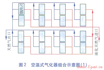 空溫式氣化器的臺(tái)數(shù)和氣化量,可跟據(jù)工程建設(shè)規(guī)模和用戶的要求綜合確定??諟厥綒饣鹘M合示意見圖2、3。