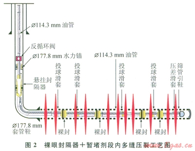 段內(nèi)多縫體積壓裂可以有效動用不同滲透率級別層段,在儲層中形成一定程度的復(fù)雜縫網(wǎng),進一步增加改造體積,從而提高單井產(chǎn)量和采收率[9-10]。具體做法是在水平井裸眼完井條件下一次性下入水平井裸眼分段壓裂管柱,段內(nèi)加暫堵劑實現(xiàn)段內(nèi)多縫,逐級投球打開滑套并封堵下層油管,實現(xiàn)水平井裸眼段多級多段壓裂改造規(guī)模(圖2)。