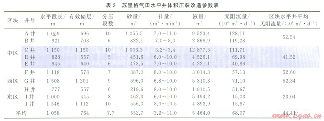 2012年在蘇里格氣田致密砂巖儲層水平井共采用體積壓裂10口,最大改造段數(shù)l0段,最大排量llm3/min,單井最大加砂量l055.5m3,最大入地液量12877.3m3,平均無阻流量68.07×104m3/d,中區(qū)、西區(qū)與相同區(qū)塊水平井采用常規(guī)壓裂相比,無阻流量明顯增加,取得了較好改造效果,東區(qū)H井由于鉆遇砂體厚度大、薄隔層發(fā)育,通過體積壓裂,增加了縱向溝通體積,也取得了好的效果(表5),而I井、J井由于鉆遇砂體厚度薄、儲層巖屑含量高、孔喉細微,儲層敏感性強,改造效果不理想。