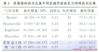 與北美頁巖氣相比,蘇里格氣田主力層20塊巖心做巖石力學(xué)實驗,單軸抗壓強度都在20MPa以上,抗拉強度基本在3~9MPa之間,盒8段楊氏模量17760~3917 MPa;泊松比0.21,山l段楊氏模量23860~33350MPa;泊松比0.25,泊松比較低。