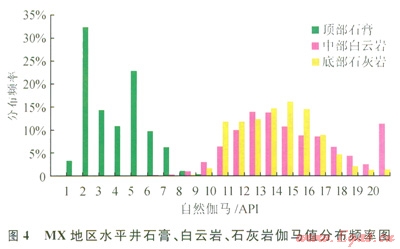伽馬值衡量的是地層中放射性物質(zhì)含量,對儲層判別基本不起作用。但根據(jù)MX地區(qū)區(qū)域資料,自然伽馬能有效識別出儲層頂部石膏層。如圖4所示,頂部石膏的伽馬值主要集中在1~8API,而中部白云巖的伽馬值主要集中在8~20API,底部石灰?guī)r的伽馬值主要集中在9~l8API,石灰?guī)r、白云巖與石膏的差異非常明顯??捎?span lang="EN-US">8API作為石膏的輔助判別上限。