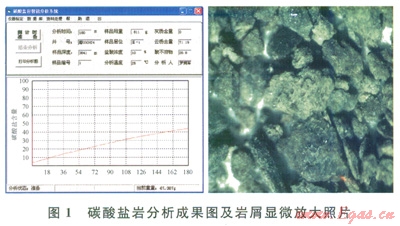 準(zhǔn)確鑒別巖屑,正確識別出地層巖性是儲層評價的首要條件,并可根據(jù)鑒別結(jié)果直接篩除掉非儲層巖性段(頂部石膏和底部石灰?guī)r)。為了準(zhǔn)確識別巖屑巖性,在利用遲到時間實測法對巖屑進(jìn)行了準(zhǔn)確歸位后,采用碳酸鹽巖分析儀對巖屑進(jìn)行逐米鑒別,并結(jié)合巖屑顯微放大掃描對巖屑巖性、顆粒及儲集空間特征進(jìn)行分析(圖1)。實鉆過程中,通過多種巖屑識別方法的綜合運用,該井巖屑識別較為準(zhǔn)確并與隨鉆伽馬具有較好的對應(yīng)性。