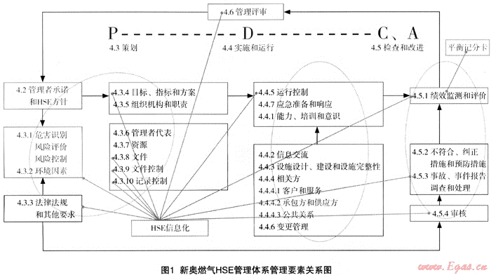 新奧燃氣參考了國際、國內范圍內有關的HSE標準,建立并發(fā)布了新奧燃氣HSE管理體系企業(yè)標準(Q/XARQ01.1-2007),覆蓋SY/T6276—1997《石油天然氣工業(yè)健康、安全與環(huán)境管理體系規(guī)范》所有要求。并要求旗下所有企業(yè)按標準要求建立并實施HSE管理體系并形成三級文件管理體系。新奧燃氣HSE管理體系企業(yè)標準各要素之間的關系如圖1所示。